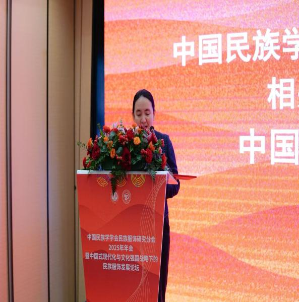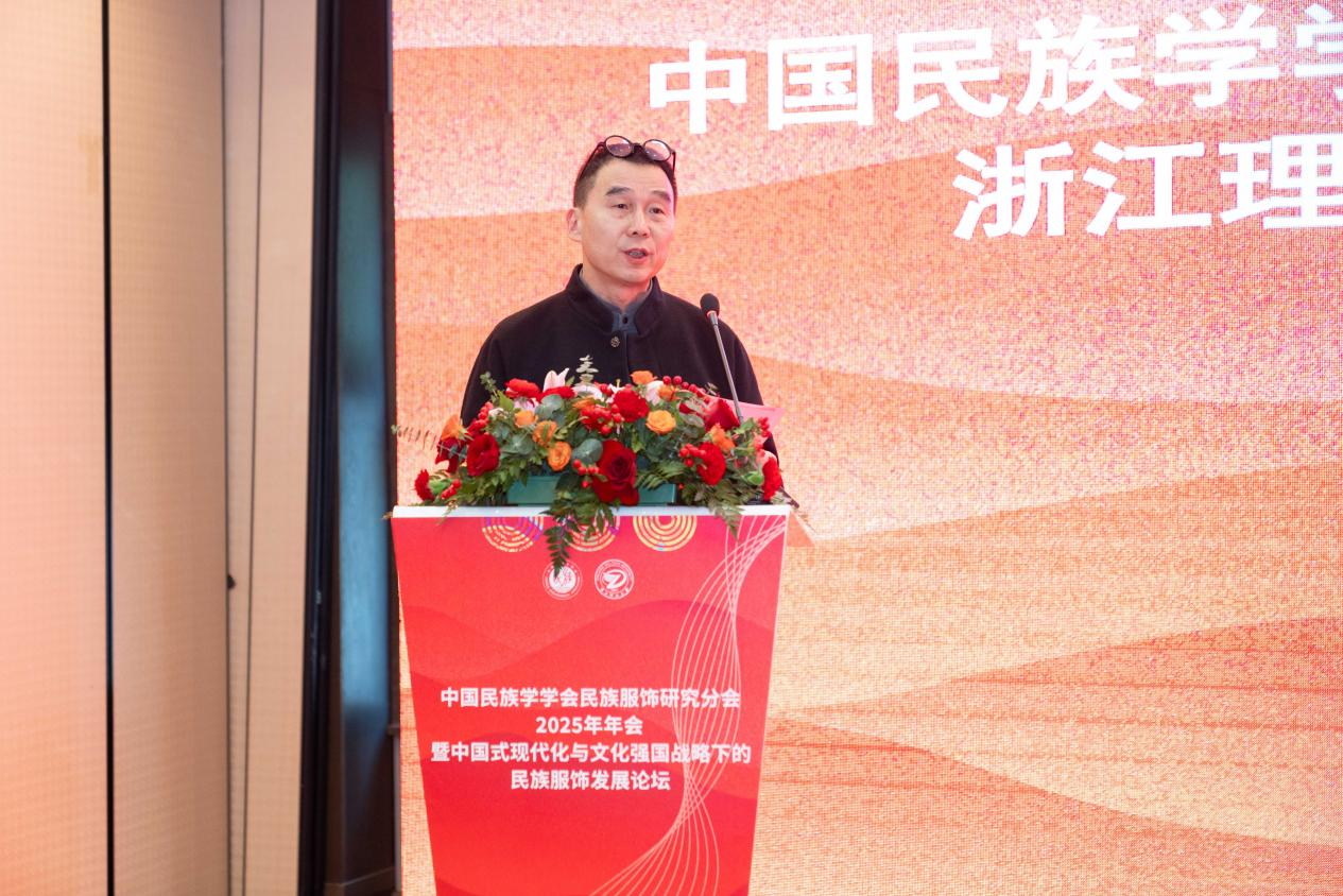 崔荣荣代表承办方致辞,他介绍了学校及服装学院在民族服饰研究与人才培养领域的深厚积淀。他表示,此次年会搭建“产学研用”协同平台,精准契合中国式现代化与文化强国战略下民族服饰文化传承创新的时代命题,学校将以此次活动为契机深化多方合作,推动学术研究与成果转化,为民族服饰文化建设贡献浙理工力量。
