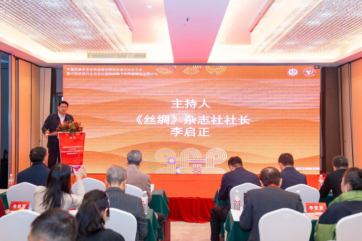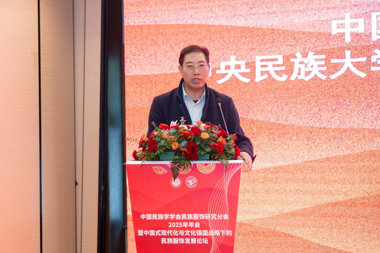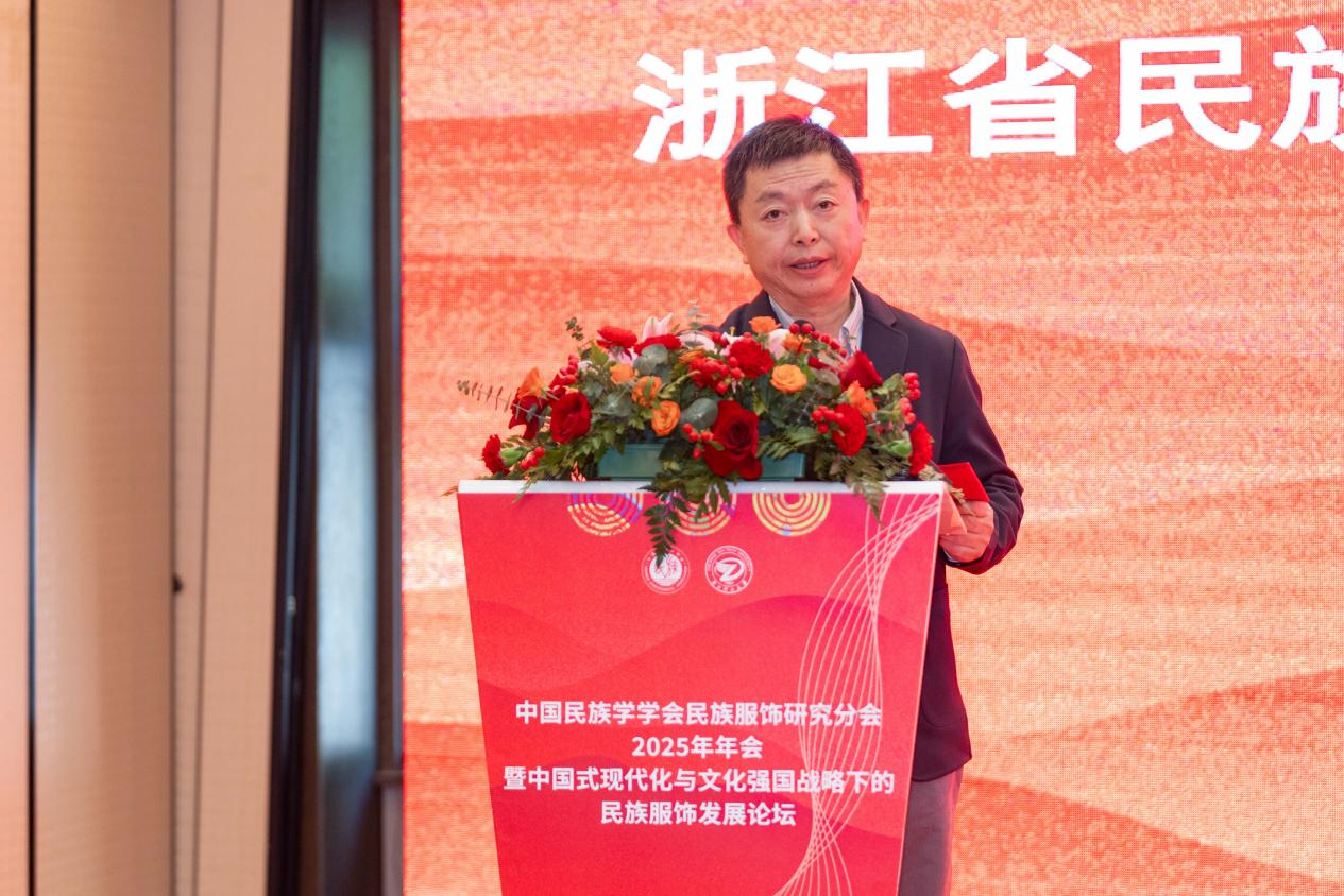 崔荣荣代表承办方致辞,他介绍了学校及服装学院在民族服饰研究与人才培养领域的深厚积淀。他表示,此次年会搭建“产学研用”协同平台,精准契合中国式现代化与文化强国战略下民族服饰文化传承创新的时代命题,学校将以此次活动为契机深化多方合作,推动学术研究与成果转化,为民族服饰文化建设贡献浙理工力量。